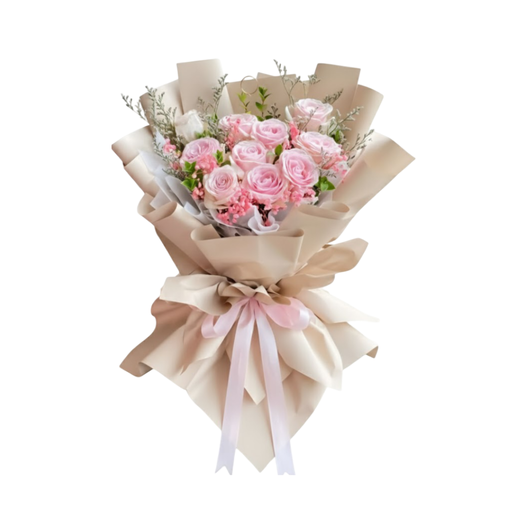 Hand Bouquet Aurelien merupakan lambang kelembutan, kasih sayang, dan keindahan yang lembut, menjadikannya pilihan sempurna untuk mengekspresikan kekaguman, rasa terima kasih, atau cinta yang penuh kehangatan. Buket tangan yang menawan ini dirancang dengan estetika yang tenang dan elegan, memadukan warna-warna pastel yang menenangkan dengan presentasi yang anggun. Inti dari Hand Bouquet Aurelien adalah koleksi bunga mawar merah muda (pink) berkualitas tinggi. Mawar merah muda dikenal secara universal sebagai simbol kebahagiaan, kekaguman, dan romansa yang lembut. Setiap kuntum mawar dipilih dengan teliti, menampilkan gradasi warna merah muda yang manis, mulai dari rona merah muda muda yang hampir seperti kulit hingga warna merah muda medium yang kaya di bagian tengahnya. Tekstur kelopaknya yang halus dan tampilan yang subur menciptakan fokus visual yang lembut namun memikat. Jumlah mawar yang berlimpah diatur sedemikian rupa untuk memberikan volume yang maksimal, menghasilkan buket yang terasa penuh dan mewah.