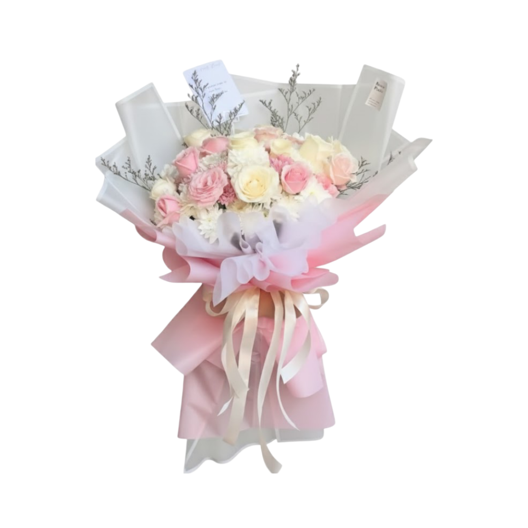 Hand Bouquet Dazzy adalah perwujudan kelembutan, kepolosan, dan keanggunan yang murni, sebuah buket tangan yang dirancang untuk menyampaikan rasa simpati, kekaguman, atau harapan baik dengan sentuhan yang lembut dan menenangkan. Buket yang cantik dan halus ini memadukan mawar-mawar dalam palet warna pastel dan netral, menjadikannya hadiah yang ideal untuk kelahiran bayi, ucapan selamat, atau sebagai ungkapan terima kasih dan kasih sayang yang tulus. Inti dari Hand Bouquet Dazzy adalah kombinasi harmonis dari Mawar Merah Muda Pucat (soft pink) dan Mawar Putih Gading (krem). Mawar merah muda pucat melambangkan kekaguman, kebahagiaan, dan kasih sayang yang lembut, sementara mawar putih gading melambangkan kemurnian, kepolosan, dan rasa hormat. Perpaduan warna yang lembut ini menciptakan palet yang sangat menenangkan dan elegan, memancarkan aura ketenangan dan keindahan yang bersahaja.