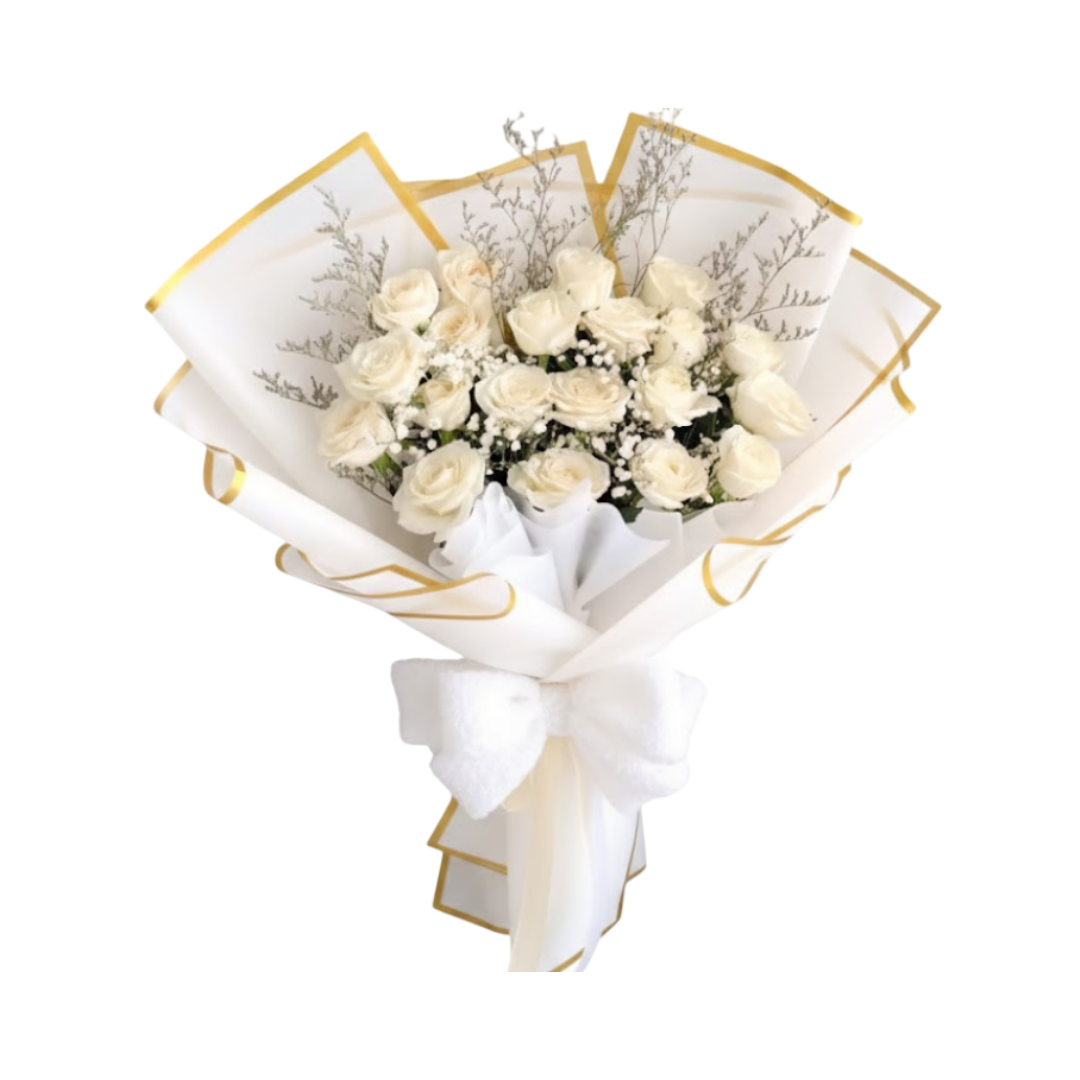 Ciri khas yang menonjolkan kemewahan Hand Bouquet Dewdrap adalah presentasinya yang murni, mewah, dan berkelas. Buket ini dibungkus menggunakan kombinasi kertas pembungkus premium yang berlapis-lapis dalam palet warna putih bersih atau putih gading. Yang membedakan adalah penggunaan kertas pembungkus dengan garis tepi atau aksen emas halus (gold trim), yang secara dramatis menambahkan sentuhan kemewahan dan keistimewaan yang berkelas tinggi. Penggunaan warna putih yang dominan pada pembungkus berfungsi untuk menonjolkan kemurnian mawar, menciptakan tampilan yang sangat anggun dan canggih. Teknik pembungkusnya menampilkan lipatan-lipatan yang terstruktur dan berlapis, menciptakan volume yang signifikan dan siluet yang besar dan berkesan. Sebagai sentuhan akhir yang menyempurnakan, buket diikat dengan pita besar dan halus, biasanya dalam warna putih bersih atau emas, yang diikat membentuk simpul yang anggun. Pita yang menjuntai menambahkan elemen kemewahan klasik dan menyelesaikan tampilan buket yang menawan dan penuh makna. Hand Bouquet Dewdrap adalah ungkapan emosi yang paling murni dan luhur, menjanjikan untuk mencerahkan hati dan meninggalkan kesan keindahan abadi.