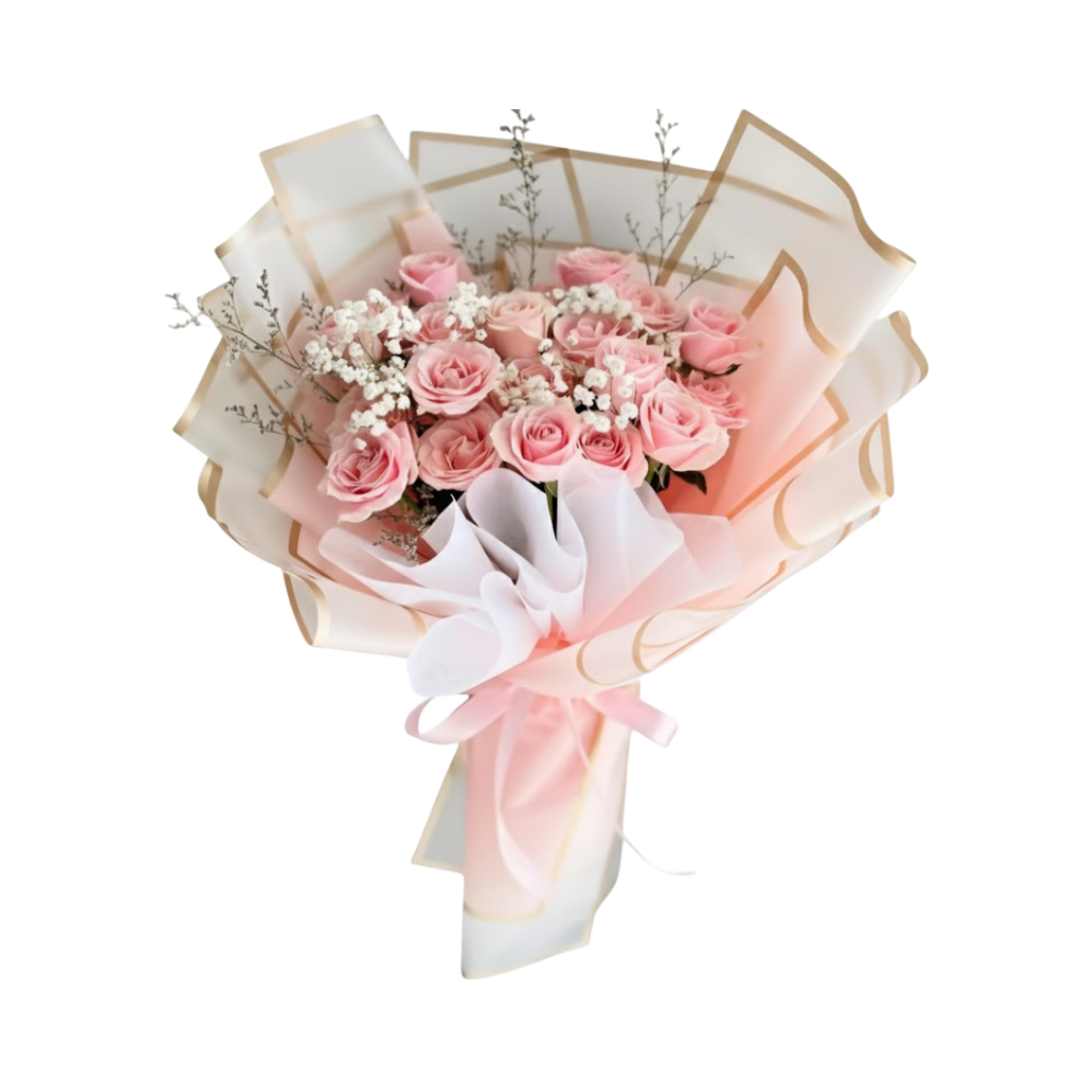 Ciri khas yang menonjolkan keanggunan Hand Bouquet Dzenifer adalah presentasinya yang sangat feminin, romantis, dan mewah. Buket ini dibungkus menggunakan kombinasi kertas pembungkus premium yang berlapis-lapis dalam palet warna merah muda pastel dan putih gading (seringkali dengan nuansa peach atau krem yang lembut). Penggunaan warna-warna pastel yang dominan pada pembungkus berfungsi untuk menonjolkan kehalusan mawar merah muda, menciptakan tampilan yang sangat anggun dan canggih. Teknik pembungkusnya menampilkan lipatan-lipatan yang terstruktur dan berlapis, menciptakan volume yang signifikan dan siluet yang besar dan berkesan. Lapisan pembungkus seringkali menggunakan kertas dengan tekstur halus atau sheer (transparan), yang menambah kesan ringan dan etereal. Sebagai sentuhan akhir yang menyempurnakan, buket diikat dengan pita satin ganda yang halus, biasanya dalam warna merah muda pastel dan putih gading yang senada dengan bunga. Pita yang diikat dengan simpul yang anggun menambahkan elemen kemewahan klasik dan menyelesaikan tampilan buket yang menawan dan penuh makna. Hand Bouquet Dzenifer adalah ungkapan emosi yang paling lembut dan tulus, menjanjikan untuk mencerahkan hari dan meninggalkan kesan keindahan abadi.