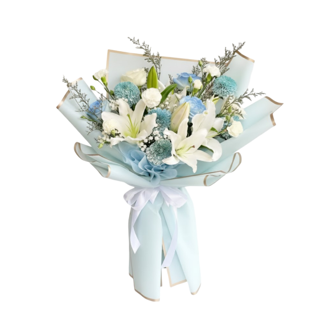 Ketenangan warna putih ditingkatkan dengan aksen Bunga Hydrangea Biru Muda yang halus, atau bunga pendamping berwarna biru/teal muda lainnya (seperti pompom krisan atau lisianthus biru, . Warna biru muda melambangkan ketenangan, kesetiaan, dan kedamaian, yang secara sempurna mendukung makna dari buket ini. Bunga-bunga kecil berwarna biru muda ini disisipkan secara strategis untuk memberikan sentuhan warna yang lembut dan dingin di antara bunga putih, menciptakan kontras yang menarik dan unik. Komposisi ini diperkaya dengan isian bunga kecil berwarna putih seperti Gypsophila (baby’s breath) dan Dedaunan Hijau Keperakan atau Statice. Elemen-elemen pelengkap ini memberikan tekstur yang kaya dan kedalaman visual, menambah sentuhan alami dan memperkuat nuansa yang tenang dan bermartabat dari buket. Seluruh bunga diatur dengan komposisi yang seimbang dan berlapis, di mana lili memberikan dimensi vertikal, dan mawar serta isian mengisi volume, memastikan buket terlihat subur dan memiliki bentuk yang elegan.