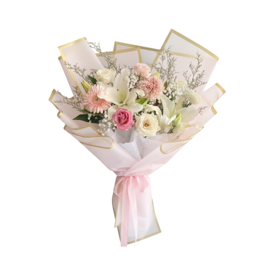 Hand Bouquet Sendroff adalah perwujudan keanggunan, kelembutan, dan kemuliaan yang bersinar, dirancang untuk menyampaikan rasa hormat, kekaguman, dan harapan yang indah dalam berbagai kesempatan, mulai dari ucapan selamat dan perpisahan (send-off) yang berkesan, hingga perayaan hari jadi yang istimewa. Buket tangan yang memikat ini menampilkan kombinasi bunga klasik yang mewah, yaitu Bunga Lili yang agung dan Bunga Mawar yang romantis, dipadukan dengan aksen bunga pendamping yang menawan. Inti dari Hand Bouquet Sendroff adalah harmoni antara Lili Putih Murni dan Mawar Merah Muda Pucat (soft pink). Lili putih melambangkan kemurnian, keagungan, dan kehormatan, memberikan buket ini tampilan yang tinggi, elegan, dan aroma yang memikat. Mawar soft pink melengkapi lili dengan melambangkan kekaguman, kebahagiaan, dan kasih sayang yang lembut. Perpaduan warna soft ini menciptakan palet yang sangat menenangkan dan elegan.