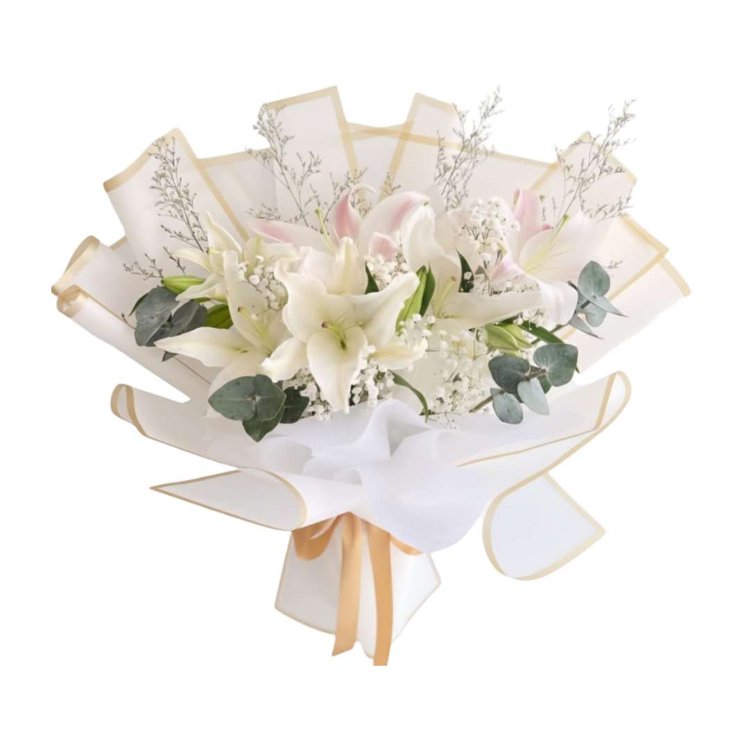 Buket dibungkus dengan kertas premium berlapis dalam palet putih bersih dengan detail aksen emas halus (gold trim). Penggunaan putih yang dominan menonjolkan kemurnian lili, menciptakan tampilan yang sangat anggun dan canggih. Diikat dengan pita satin emas/putih.