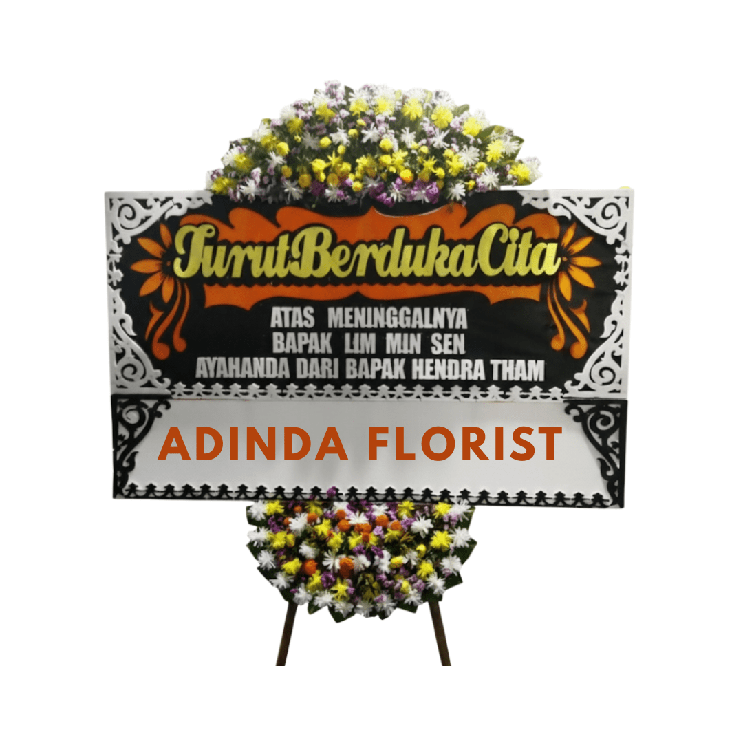 Karangan Bunga Papan Tredy adalah persembahan duka cita yang formal, khidmat, dan dirancang dengan estetika klasik yang kuat, menjadikannya pilihan yang berwibawa untuk menyampaikan rasa belasungkawa dan penghormatan terakhir. Papan bunga ini secara efektif memadukan kontras warna monokromatik hitam dan putih dengan aksen warna yang hangat, menciptakan statement visual yang serius namun tetap elegan di lokasi duka.