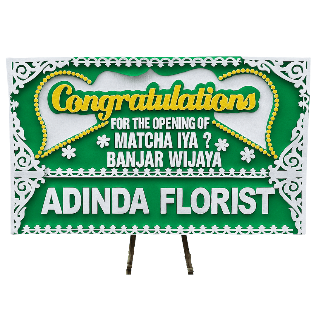 Karangan Bunga Papan Ziechz ditopang oleh dua penyangga yang terbuat dari material kayu atau besi, yang dirancang untuk menjaga stabilitas papan horizontal yang besar ini. Berbeda dari papan vertikal tradisional, papan horizontal ini cenderung lebih modern dan lebih menyerupai billboard mini. Papan bunga ini adalah pilihan sempurna untuk acara pembukaan yang ceria, memastikan pesan dukungan dan harapan baik tersampaikan dengan gaya yang modern, eye-catching, dan penuh semangat.